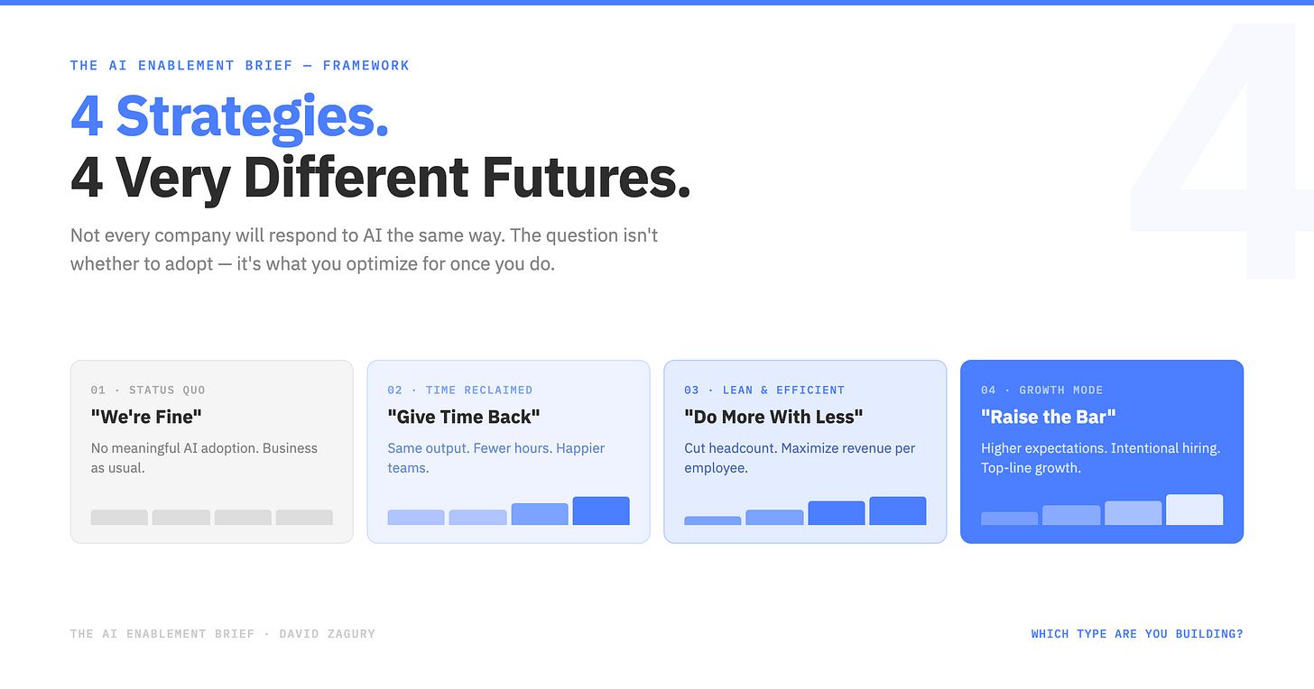 The “Give Time Back” organizations adopt AI and return the capacity to their employees. Shorter weeks. More flexibility. Same output expectations. This is the work-life balance narrative playing out in practice. It’s not wrong — but it’s not a growth strategy.